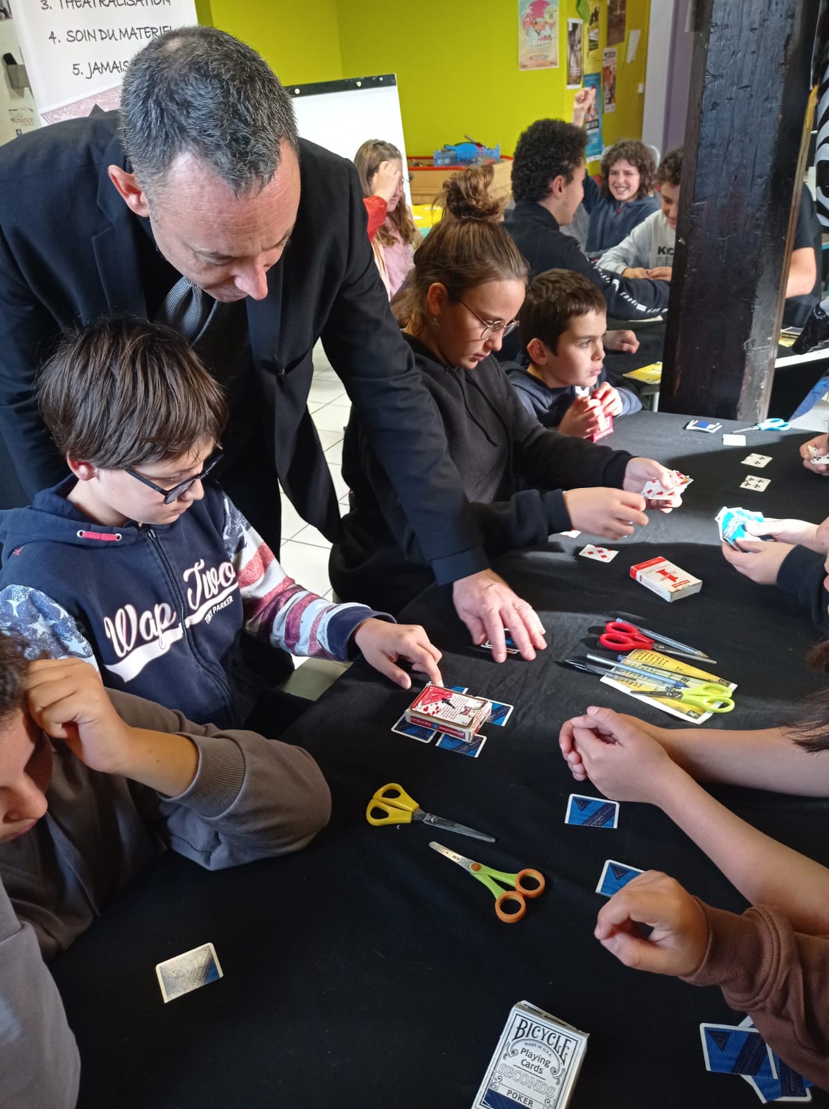Je présente d’abord le tour devant les participants. Je pique la curiosité. Un échange s’ensuit pour déceler quelques pistes logiques puis rapidement, on passe aux explications complètes (protocole, astuces, théâtralisation, détournement d’attention, posture…). C’est ensuite que rentre en jeu, le travail en binôme (magicien/spectateur). Ils vont s’approprier cette expérience magique en face à face pour en comprendre toutes les subtilités. Enfin, avant de passer à la suite du contenu, un ou deux volontaires expérimentent, aux yeux amusés de tous, leur nouveau talent. Objectif: Que les participants puissent reproduire, chez eux, les tours enseignés dans un temps (relativement) court après l’atelier.